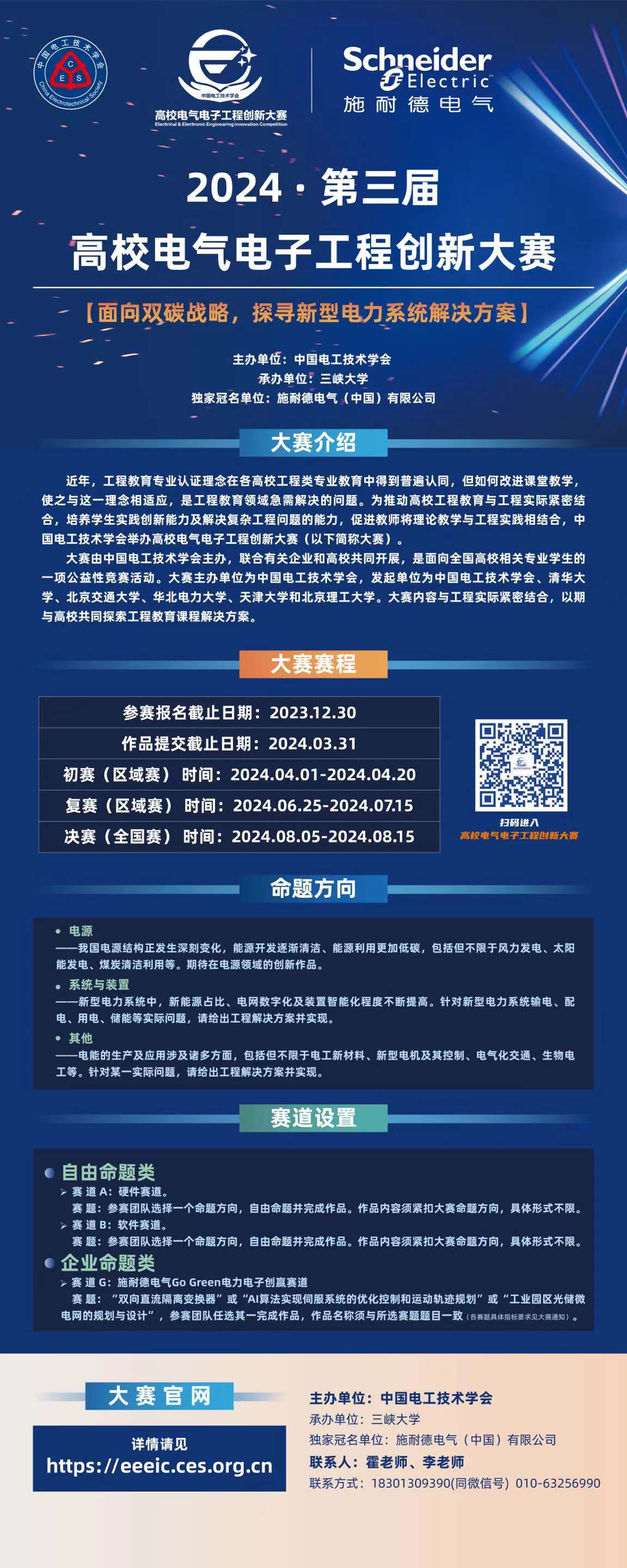 主要内容:大赛设置四个命题方向:新能源与综合能源、未来电网、储能和电力工业软件,分为“常规赛项”与“企业赛项”,“常规赛项”为自由探索类,分硬件和软件两个赛道,“企业赛项”为定向命题类。大赛分初赛、复赛和决赛三个阶段设置赛程,初赛分区域进行,各赛区设负责高校负责组织各赛区赛事,初赛环节主要考察参赛作品的可研报告,初赛获一等奖作品进入复赛,复赛和决赛均为全国赛,复赛以作品展示及答辩的形式进行,筛选出的作品进入决赛,决赛采取现场比赛。